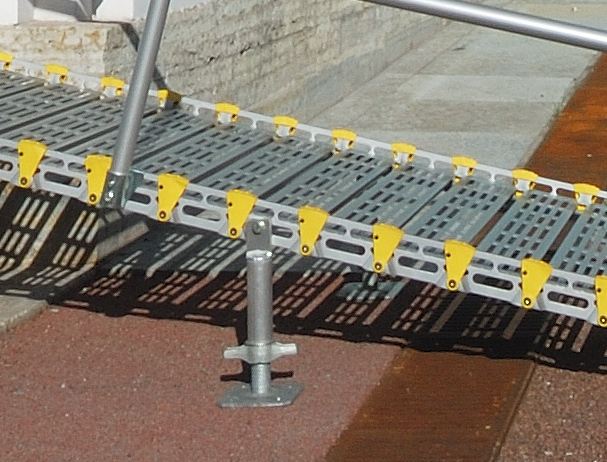 Roll-A-Ramp support stands are required for any ramp longer than 10 feet. We suggest placing a pair of support stands approximately every 6-7 feet under the ramp. The support stands attach to the ramp using the T-handle bolts and block-nuts provided. No special tools are required. Also, our custom ramp support stands are adjustable based on the height ranges below.